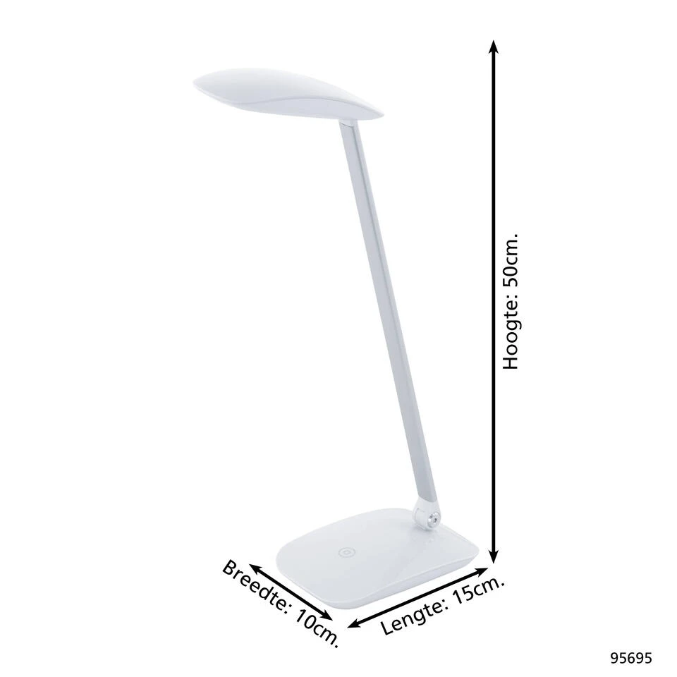 De EGLO Cajero is een bureaulamp gemaakt van kunststof met een hoogglans witte afwerking. Deze energiezuinige lamp heeft een energiezuinige geïntegreerde LED module met een wattage van 4,5W. De tafellamp geeft een helder en neutraal wit licht. De lamp is voorzien van een touchdimmer waarmee de lamp in vier lichtsterktes te dimmen is. De tafellamp Cajero is toepasbaar verschillende (home) office omgevingen.