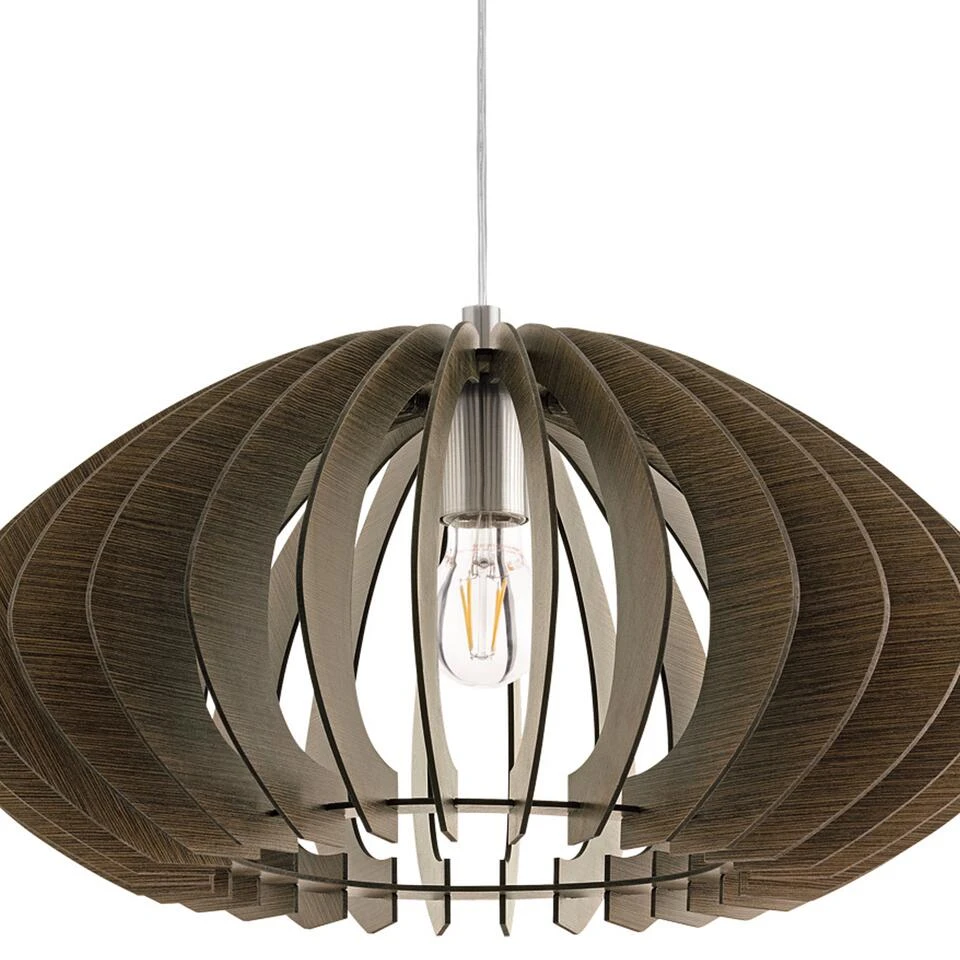 De EGLO Cossano 2 is een hanglamp gemaakt van staal en geperst hout in een bruine kleur. Door de combinatie van geperst hout en het unieke design is deze lamp helemaal van deze tijd. Deze hanglamp met E27 fitting wordt geleverd exclusief lichtbron en is geschikt voor een maximaal wattage van 25W. De hanglamp Cossano 2 is toepasbaar in diverse woon- en/of werkruimten.