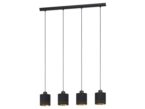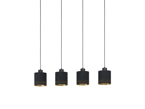 Hanglamp Esteperra van Eglo is een moderne plafondlamp met zwarte lampenkap uit textiel en gouden binnenkant. Perfect om een gezellige sfeer te creëren in je woonkamer of eetkamer. De geperforeerde details in het goudkleurige staal zorgen voor een prachtig lichtspel. Plafondlamp Esteperra is beschikbaar in diverse uitvoeringen.