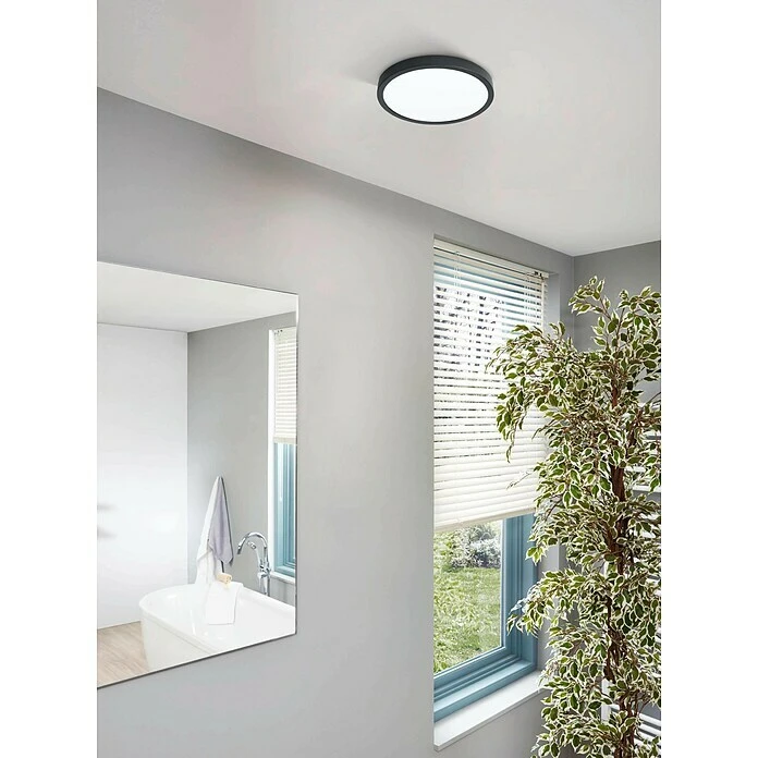 De LED opbouwlamp FUEVA 5 van zwart metaal met een zeer lage bouwhoogte van slechts 28 mm past in bijna elk interieur. Dankzij de spatwaterbescherming (IP44) kan hij in de badkamer worden gebruikt. De geïntegreerde LED’s geven een aangenaam warm wit licht en zijn niet zichtbaar door de witte diffusor. Door de geringe inbouwhoogte kan de plafondlamp ook probleemloos als wandlamp worden gebruikt. De hoogwaardige armatuur zonder zichtbare schroefverbindingen op de behuizing is bijzonder eenvoudig te installeren dankzij de speciale plafondbeugel. Door het tijdloze ontwerp van de opbouwlamp kan ze in elke ruimte worden gebruikt, of het nu in de badkamer, woonkamer, slaapkamer, hal of eetkamer is.